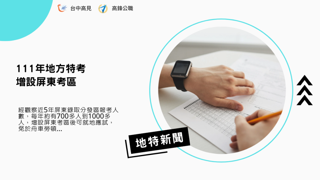 考選部今天說,為回應屏東縣政府在地用人需求,考選部將在111年地方特考增設屏東考區,以便利屏東在地應考人就近應試,符應地方政府進用及留用在地人才需求。