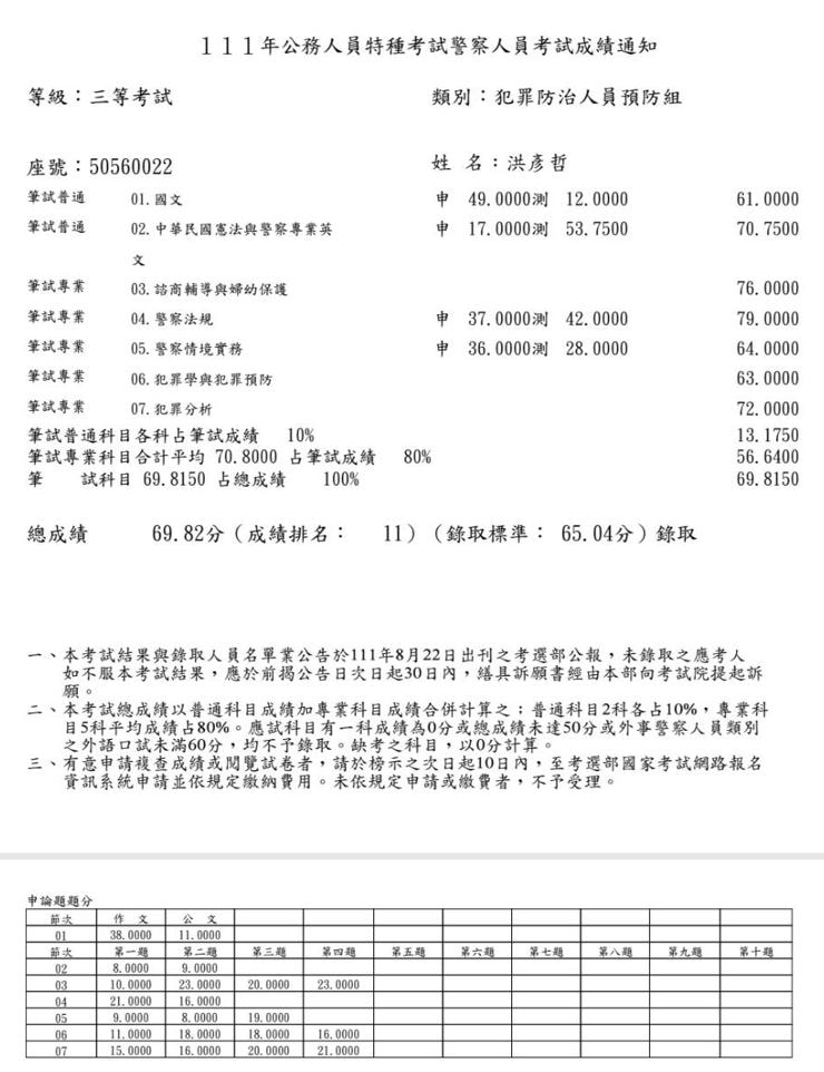 【111年警特】正取三等犯防警察|107特_洪彥哲上榜心得