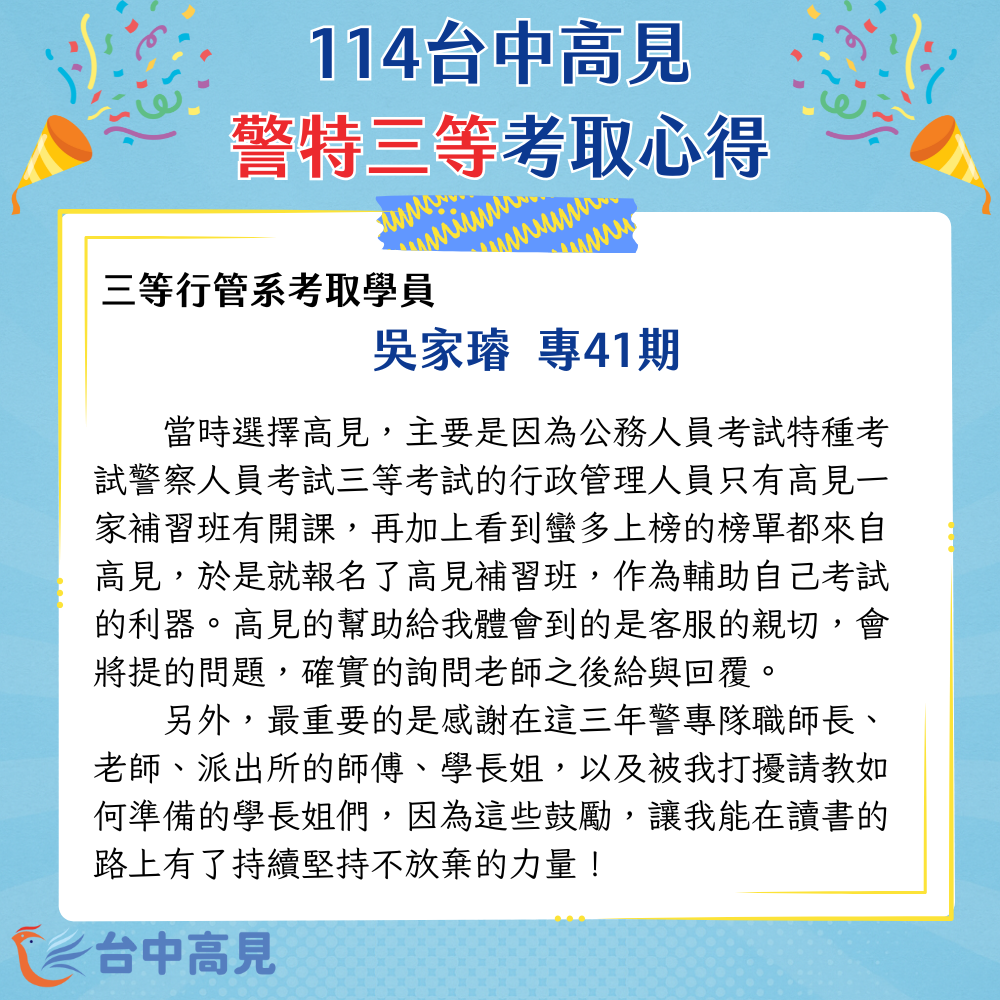 另外,最重要的是感謝在這三年警專隊職師長、老師、派出所的師傅、學長姐,以及被我打擾請教如何準備的學長姐們,因為這些鼓勵,讓我能在讀書的路上有了持續堅持不放棄的力量!