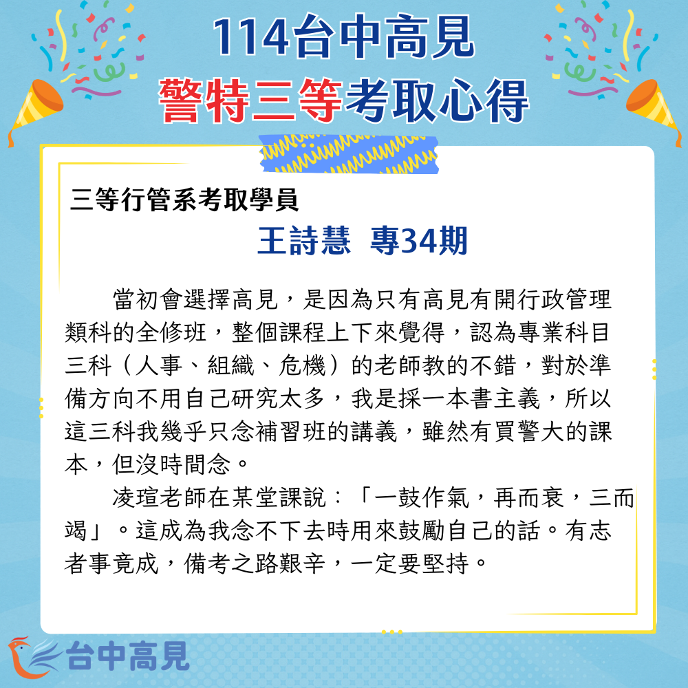 當初會選擇高見,是因為只有高見有開行政管理類科的全修班,整個課程上下來覺得,認為專業科目三科(人事、組織、危機)的老師教的不錯,對於準備方向不用自己研究太多,我是採一本書主義,所以這三科我幾乎只念補習班的講義,雖然有買警大的課本,但沒時間念。