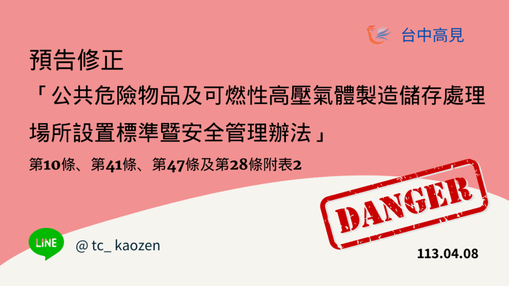 - 主旨:預告修正「公共危險物品及可燃性高壓氣體製造儲存處理場所設置標準暨安全管理辦法」第10條、第41條、第47條及第28條附表2。