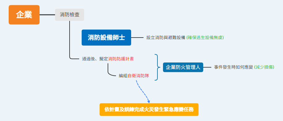 • 每家企業能配置專職消防人員或設備師士,對逃生觀念比較清楚,對消防設備的使用與維護也比較專業