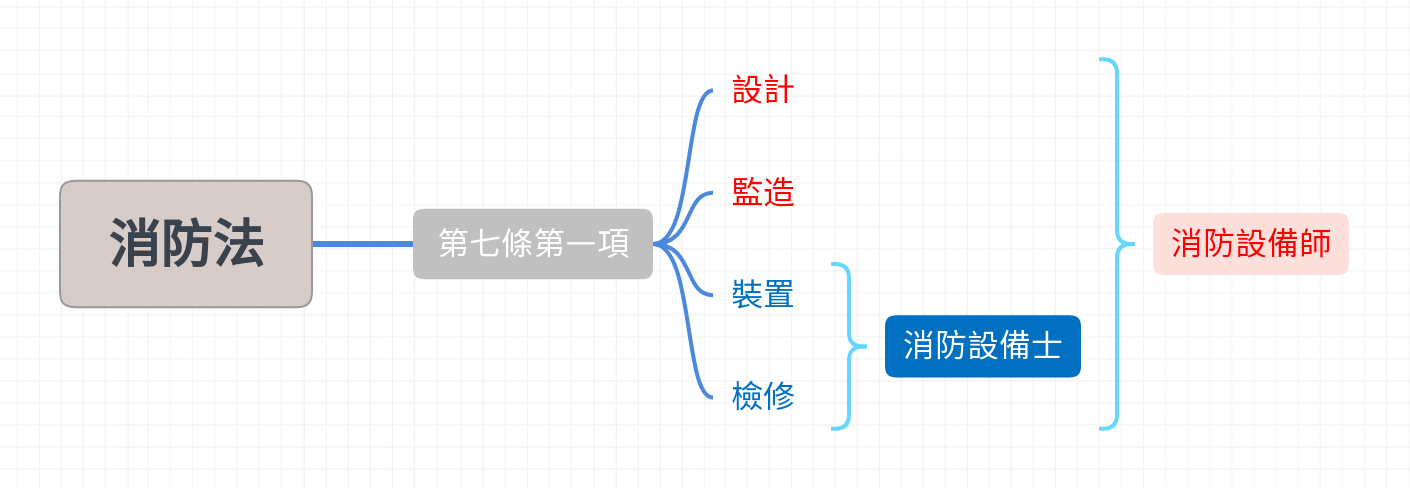 • 依消防法第七條規定:各類場所消防安全設備設置標準設置之消防安全設備,其設計、監造應由消防設備師為之;其裝置、檢修應由消防設備師或消防設備士為之。