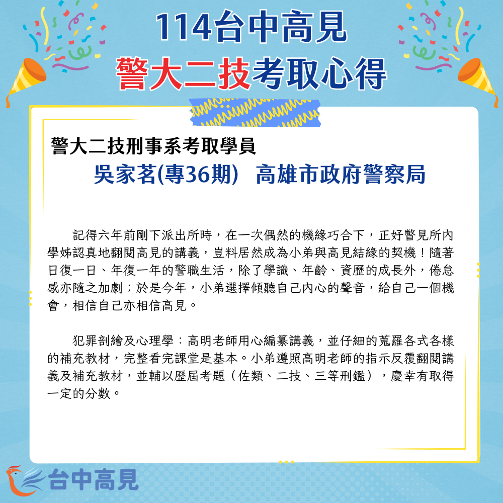 犯罪剖繪及心理學:高明老師用心編纂講義,並仔細的蒐羅各式各樣的補充教材,完整看完課堂是基本。小弟遵照高明老師的指示反覆翻閱講義及補充教材,並輔以歷屆考題(佐類、二技、三等刑鑑),慶幸有取得一定的分數。