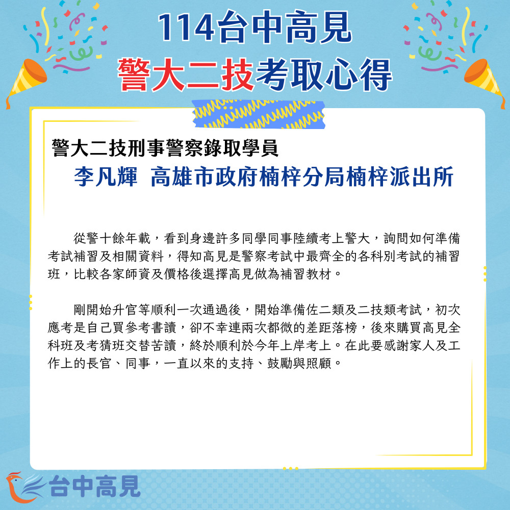 犯罪心理學與犯罪剖繪:該科目在113年剛改考科時,沒有考古題可以參考,因為抓錯方向所以考出來不盡人意,114年再度準備考試時,詢問警大刑事系在職學姊告知可以參考廖有祿老師著作的犯罪剖繪理論與實務,第一次大概閱讀過後,第二次就反過來搭配前次考古題抓出考試模式,嘗試自己在課本上畫重點,再搭配高見高明老師重點解析反覆觀看,雖然考完發現許多答案一念之差多選或少選,被倒扣許多分數,但是整體上觀念都沒問題。