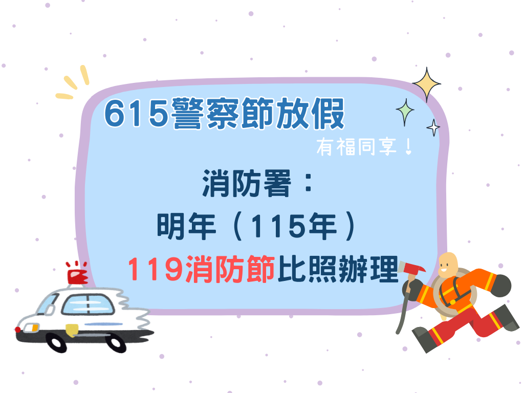 那麼消防人員的119節是否也適用?👨🚒消防署回應表示,依同條例規定,「1月19日消防節」亦將比照警察節放假辦理。未來119消防節當天,符合條件的單位可放假;如需值班或留守者,亦可安排擇日補休。