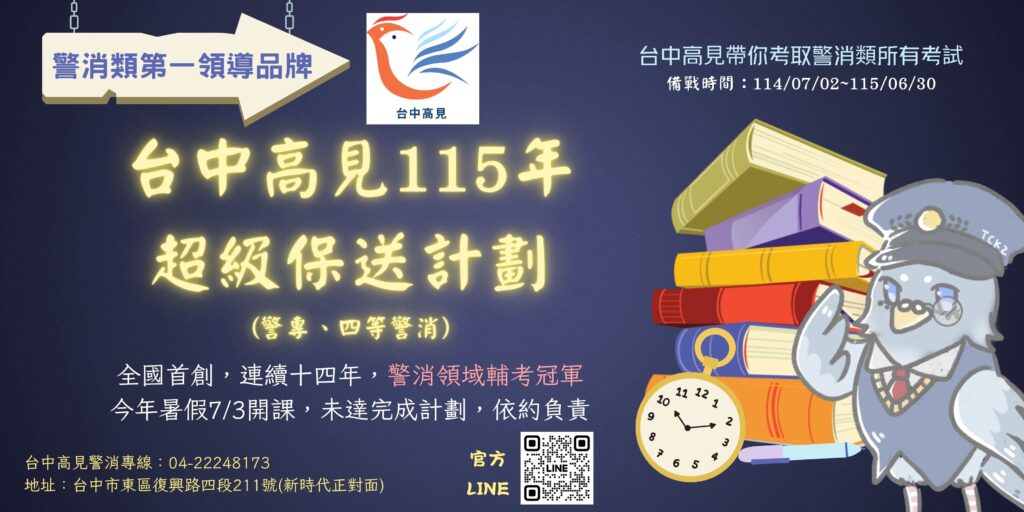 • 授課過程會為未來三等、消佐、升官等、警大二技考試預做鋪墊