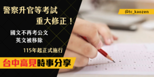 【時事分享】重大變革!警察升官考試可能「不考英文」!考科調整一次看懂! 2025-06-17 尚無留言 對現職警察人員來說,升官考試是職涯的重要關卡。最新修正草案公布,自115年起,國文與法學知識將取代英文與法學知識組合,且國文作文占比將大幅上升!準備115年升等 閱讀更多 »