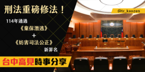 【時事分享】刑法重磅修法!114年通過《棄保潛逃》+《妨害司法公正》新罪名 2025-06-17 尚無留言 立法院於114年5月13日三讀通過刑法部分條文修正案,針對近年輿論與實務高度關注的「棄保潛逃」與「司法關說」議題,正式入法且加重刑責。這次修法也是刑法中首次新增 閱讀更多 »