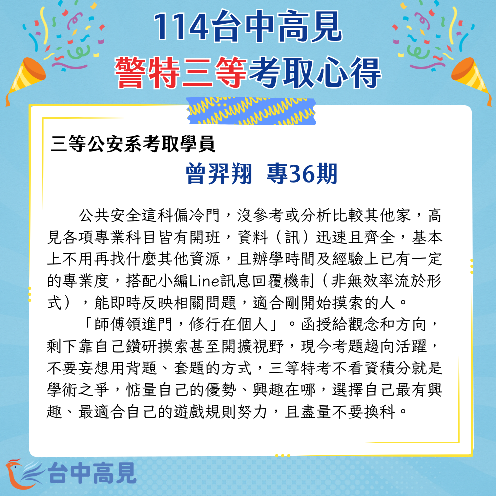 謝謝程緣老師的用心,在思維及邏輯上有很大的共鳴,透過不斷地縱向、橫向延伸思考,讓讀書的過程是活躍的,雖然考科是死的,也許這輩子不會再接觸,但相關核心精神已悄然改變思維,很慶幸有公共安全這科及程緣老師讓我拓展視野。